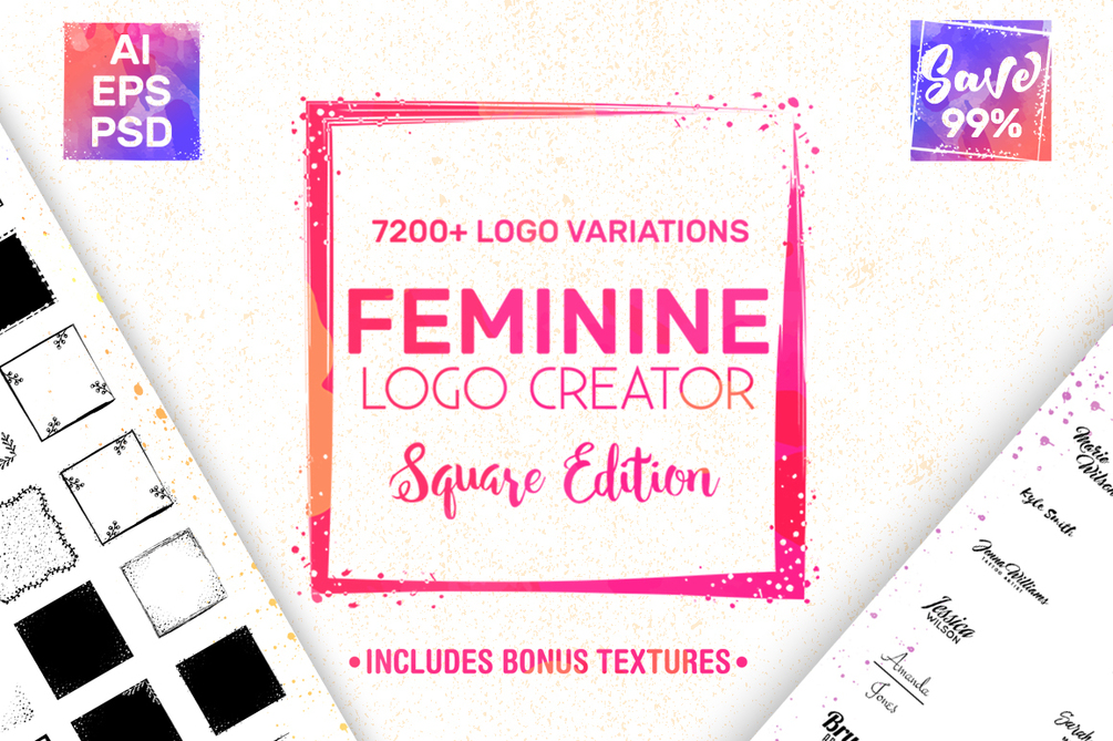 120 Vector shaped elegant Squares + 60 typographic logos make it 7200+ different possible logo variations.All shapes and fonts are made with the latest feminine trends in mind. Just choose your favorites, mix them up and make an awesome looking logo for yourself or your customers!